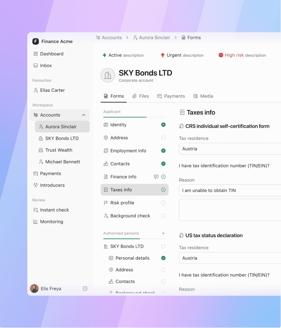 Into a single, intuitive system. Client data is collected once and reused across workflows. Risk is assessed in context. Monitoring is linked directly to verified entities and relationships. Less duplication. Fewer errors. Clearer decisions. Compliance becomes structured, scalable, and ready for growth.